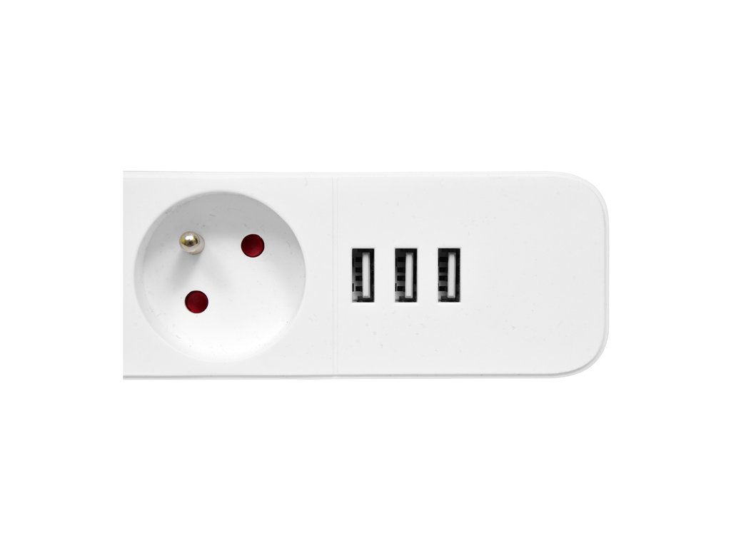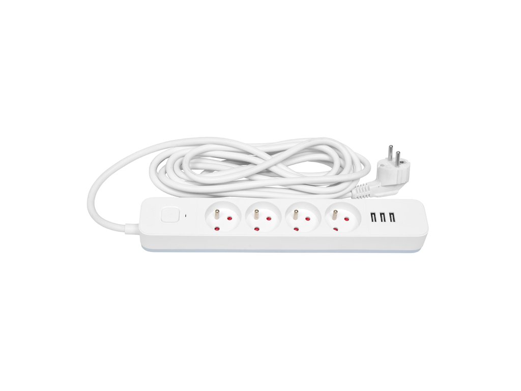 Tabuľka hodnôt: dĺžka kábla - 3m# počet zásuviek - 4# USB výstupy - 3 x 2,4 mA/5V/max.12W# vypínač - áno# farba - biela# napätie/prúd - ~250V / 16A max.# typ izolácie - PVC# krytie - IP20# kábel - H05VV-F, 3x1,5 mm2# max. záťaž - 3680W# Certifikácia - CE, ROHsDodatočné parametre
